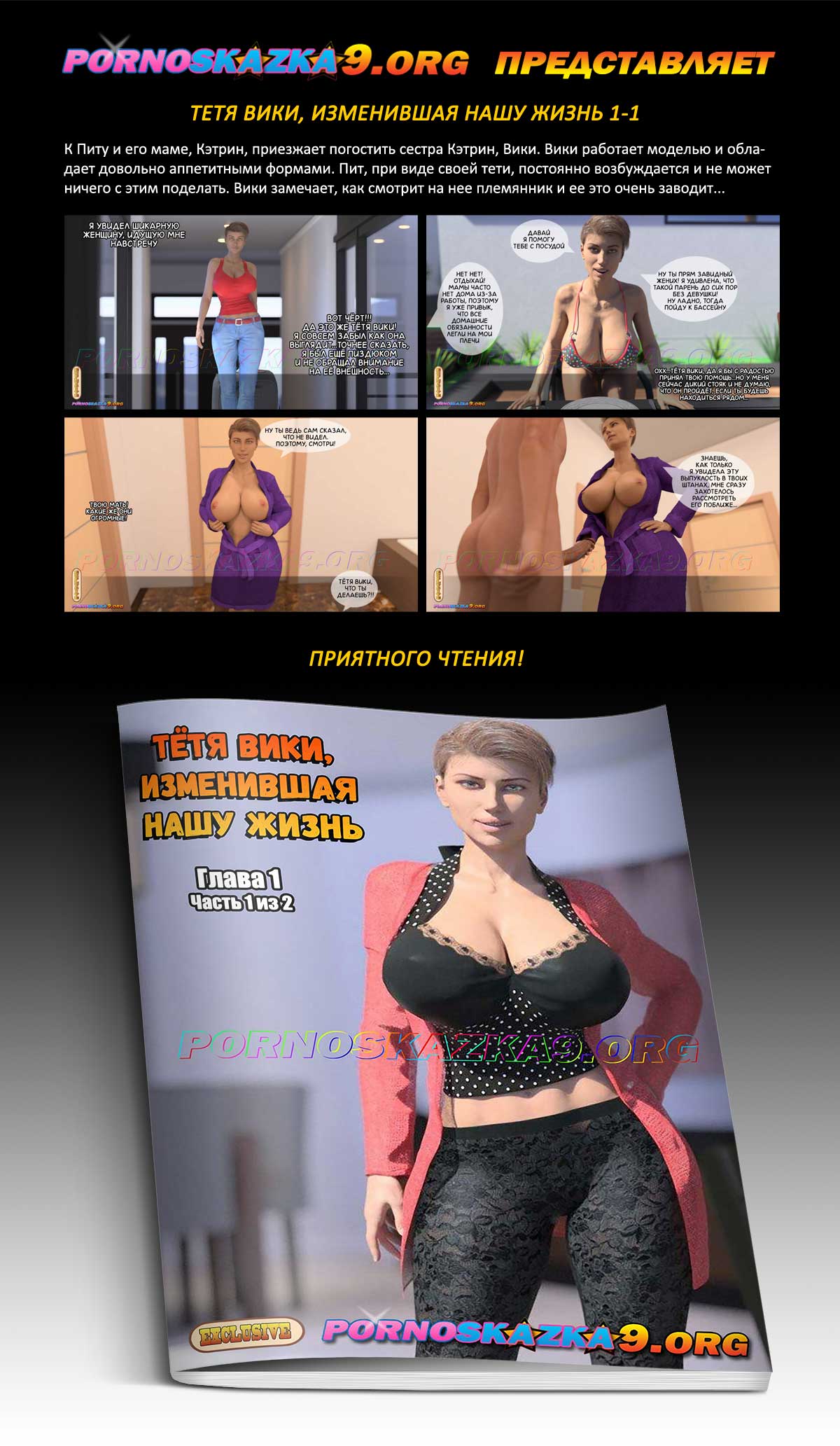 Порно комикс «Тетя Вики, изменившая нашу жизнь. Глава 1. Часть 1 из 2.» К Питу и его маме, Кэтрин, приезжает погостить сестра Кэтрин, Вики. Вики работает моделью и обладает довольно аппетитными формами. Пит, при виде своей тети, постоянно возбуждается и не может ничего с этим поделать. Вики замечает, как смотрит на нее племянник и ее это очень заводит…